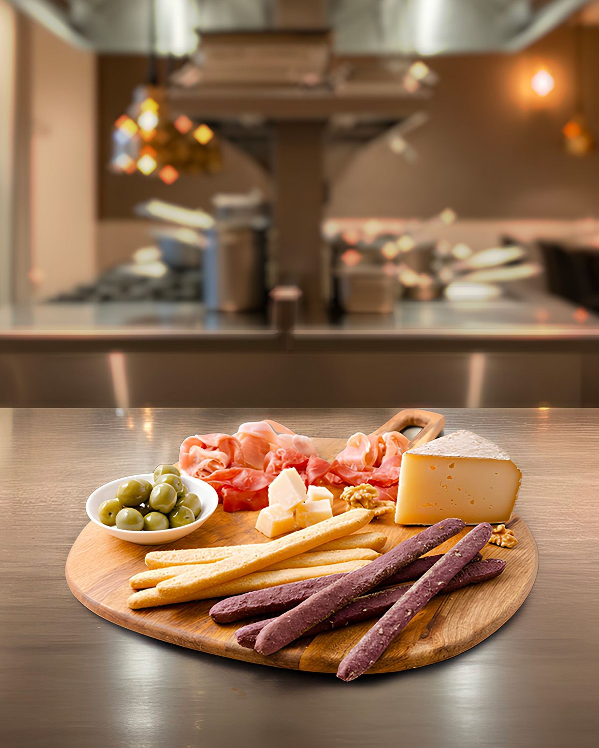Disporre su un tagliere diverse tipologie di salumi, formaggi freschi e/o stagionati, olive e frutta secca in modo bilanciato.