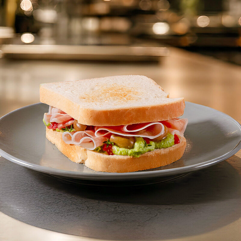 Toast con guacamole, prosciutto crudo e olive taggiasche Pane a fette Toast con guacamole, prosciutto crudo e olive taggiasche