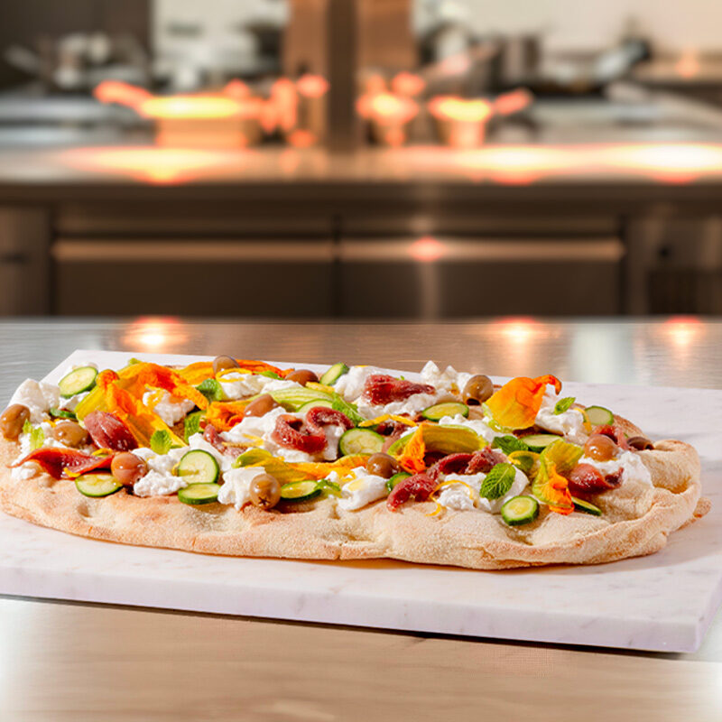 Pinsa con fiori di zucca, filetti di alici e burrata Pinsa Pinsa con fiori di zucca, filetti di alici e burrata